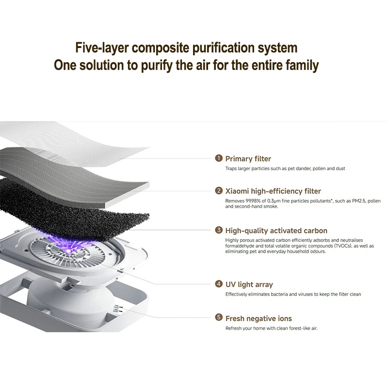 • سیستم فیلتراسیون پنج‌لایه شامل HEPA-type، کربن فعال، UV و یون منفی