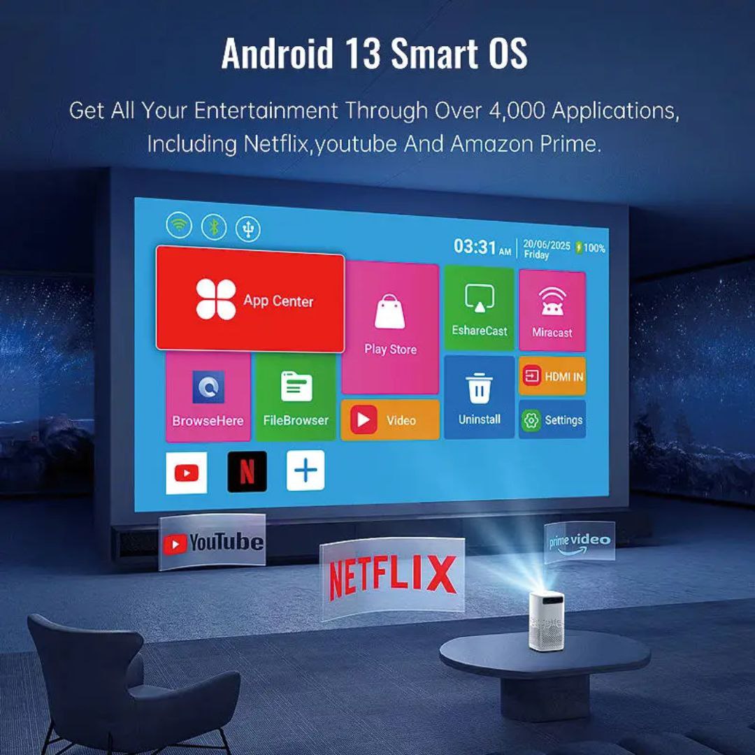 Emotn H1 Mini Beamer Projector یک ویدئو پروژکتور اندروید شارژی قابلحمل است که مخصوص کسانی طراحی شده که میخواهند در سفر، کمپ، خانه یا محل کار بدون نیاز به کابل برق مستقیم تجربه بزرگنمایی تصویر را داشته باشند. با بهرهگیری از سیستمعامل Android 13، میتوانید اپلیکیشنهای پخش فیلم و سرویسهای استریم را مستقیماً روی پروژکتور نصب و اجرا کنید، بدون اینکه به دستگاه خارجی متصل شوید.