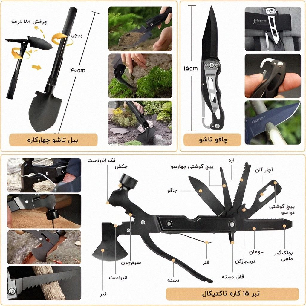 • مجموعه ابزار ضروری بقا و نجات (چاقو، ابزار چندکاره، آتش‌زنه / اره / قطب‌نما و …)